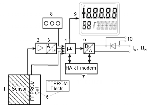 西門子壓力變送器產生的信號被信號放大器放大后,經模–數轉換器轉換成數字信號。在微處理器中,經線性和溫度校正后,再經數–模轉換器(轉換成直流4-20mA輸出信號。一個二極管電路提供反向極性保護,外部指示(電壓降<0.5v)也可以連接到這個電路上。涉及測量元件的電子數據和變送器功能參數數據被存貯在兩個EEPROM 中。 你可以通過3個輸入調整鍵直接在測量點對西門子壓力變送器進行參數調整,可以在數字顯示中讀取測量結果、故障信息和工作方式。也可以通過HART調制解調器,按照HART協議進行參數調整。